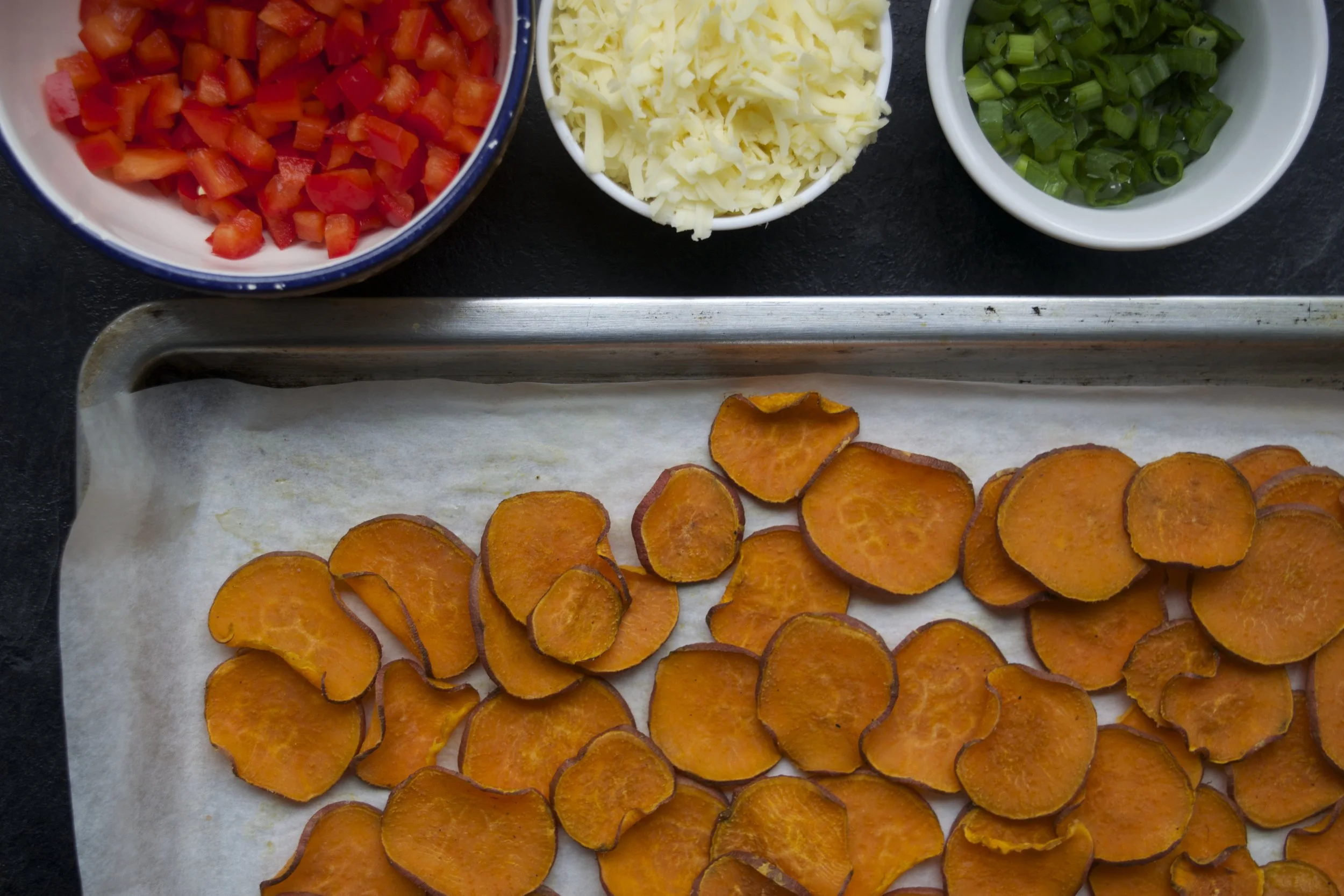 2. Bake the sweet potato for 20 minutes, flipping the rounds halfway through. Layer all of the baked sweet potato onto one of the baking sheets, top with the cheese, red pepper, and green onion, return to the oven and bake for another 10 minutes until the cheese is melted.