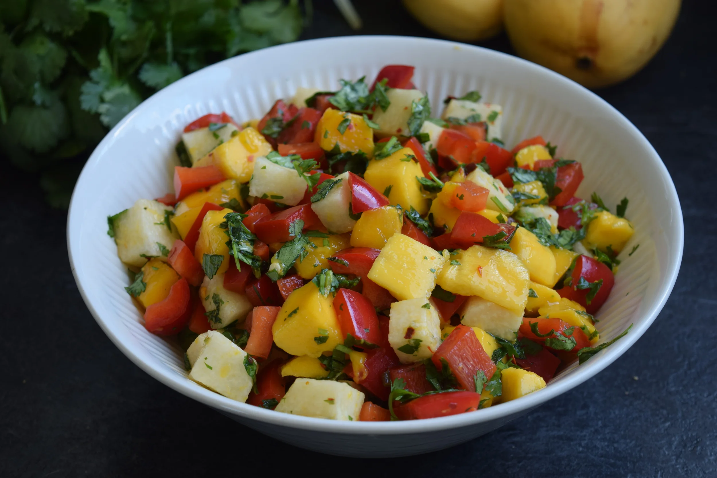 1. In a medium bowl combine the chopped mango, red pepper, jicama, cilantro, and mint.