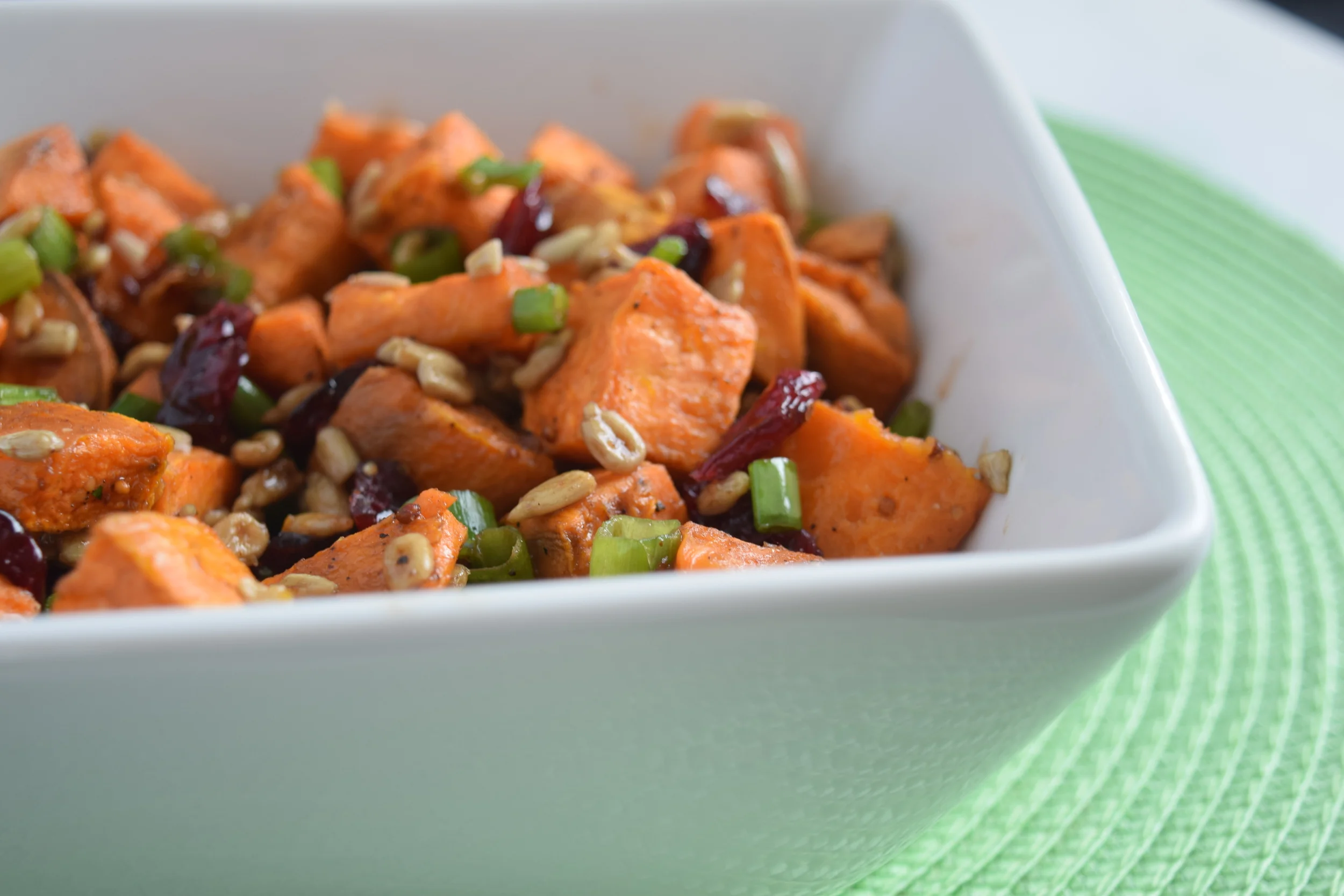 2. Whisk together the olive oil, balsamic, maple syrup, dijon, salt, and pepper. Allow the Sweet potato to cool, then toss with sunflower seeds, cranberries, green onion, and dressing.