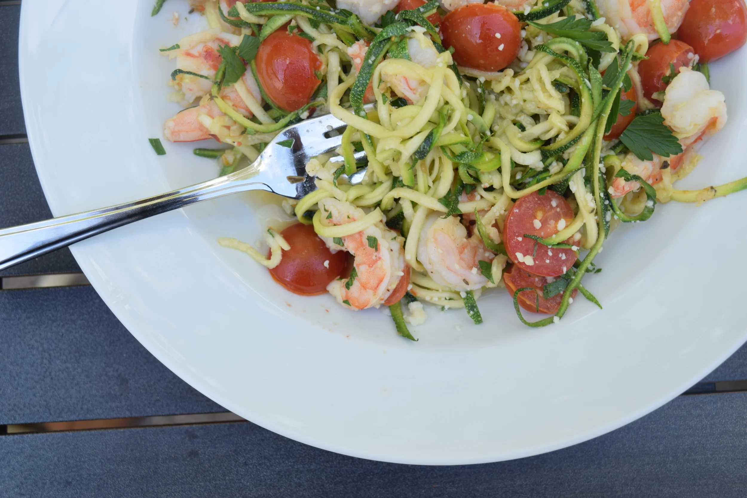 3. Add the spiralized zucchini, and toss to coat in the sauce. Add chopped parsley, lemon juice, and parmesan if using.