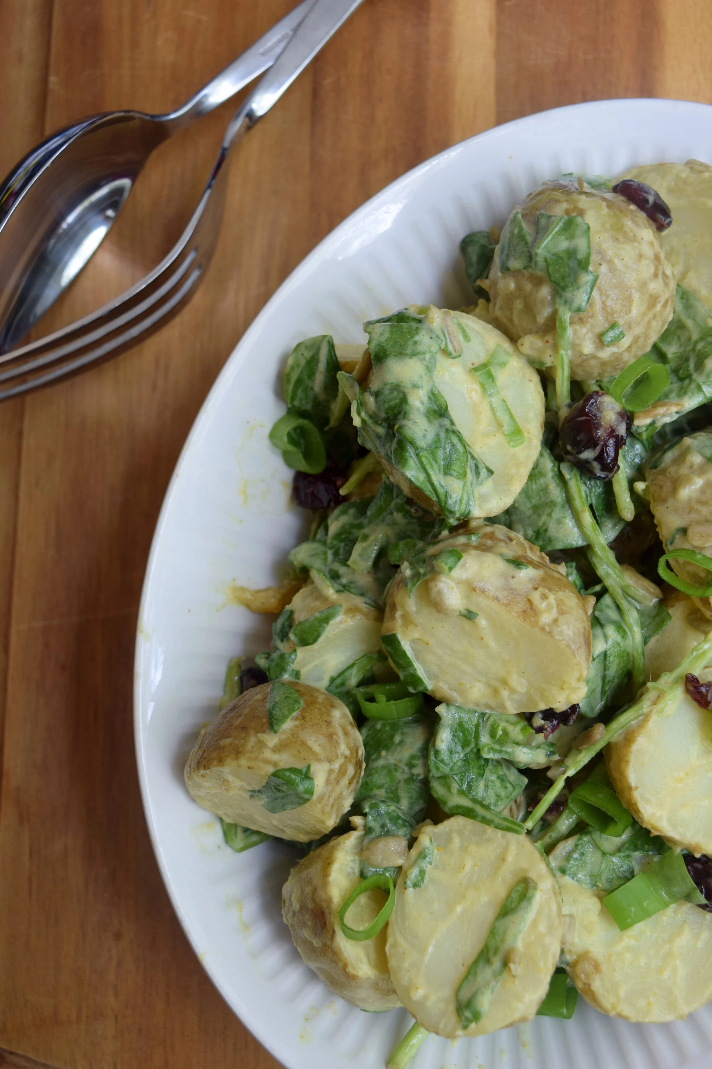3. Add potatoes to green onion, then add dressing and stir to coat. Stir in the spinach sunflower seeds, and cranberries if using. The spinach will begin to wilt as a you stir. Serve immediately, or cover and refrigerate. Salad will keep for up to 3 days in the refrigerator.