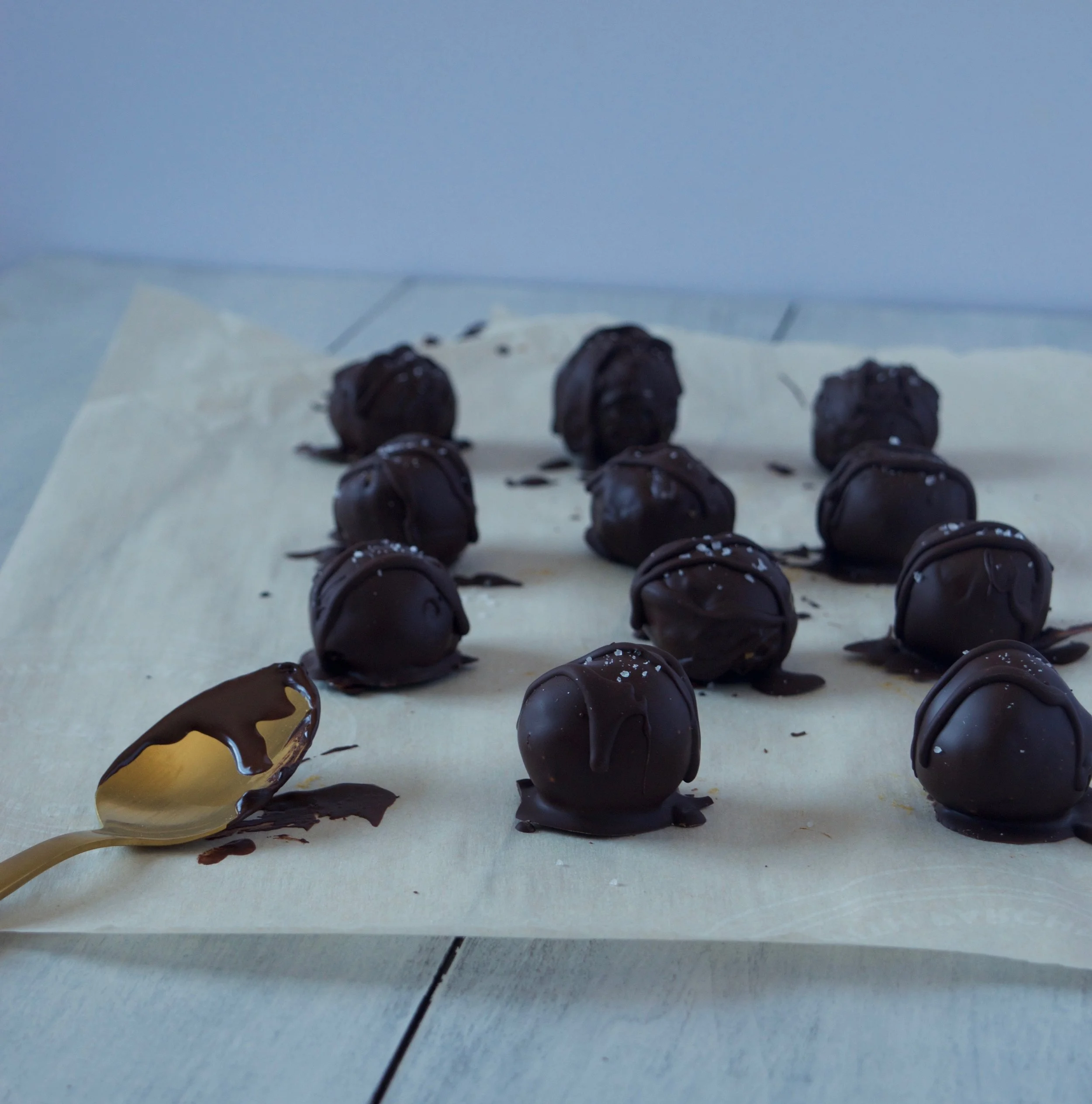 4. Drop the date caramel balls into the melted chocolate one at a time. Fully coat the date caramel in chocolate then lift it from the bowl using a fork and let the excess chocolate drip off before placing it back onto the lined baking sheet. Sprinkle with sea salt if using, and repeat with remaining date caramel balls. Return the truffles to the freezer until the chocolate is fully set. Store in an airtight container in the refrigerator.