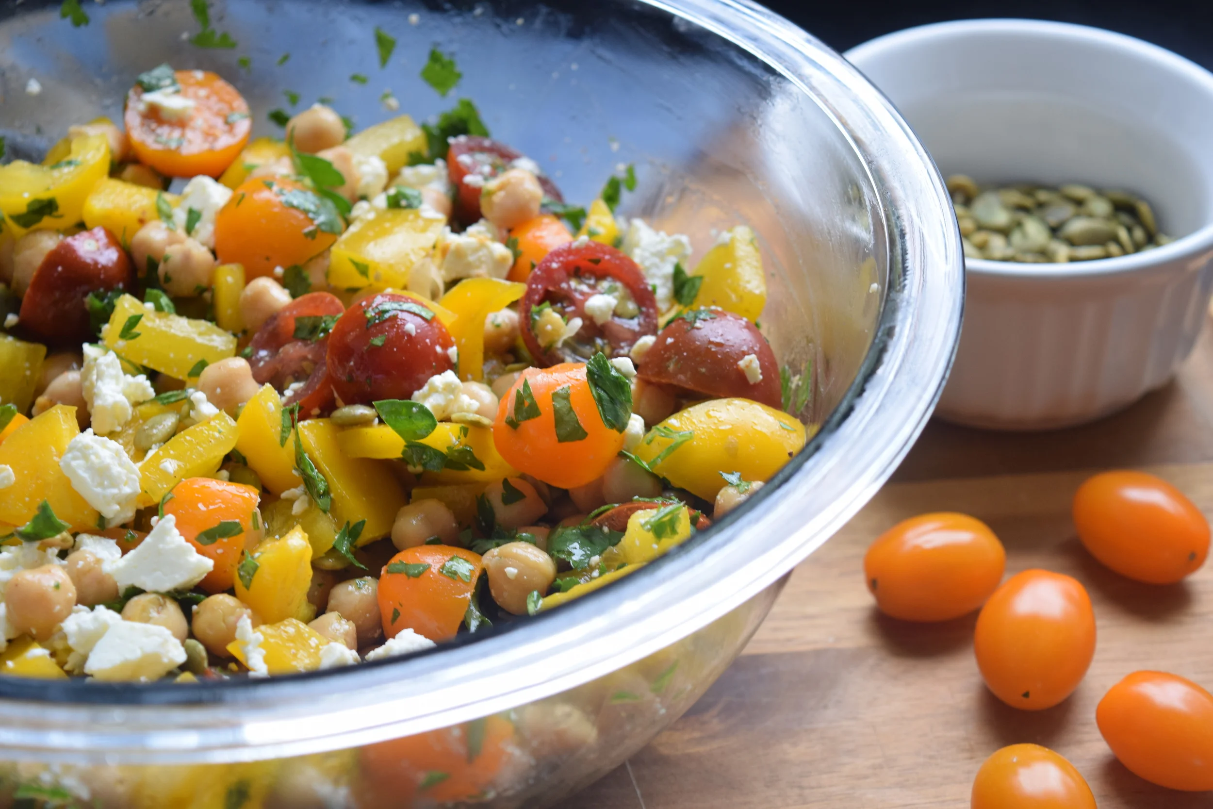 1. In a medium bowl toss together drained chickpeas, bell pepper, cherry tomatoes, herbs, and pumpkin seeds.